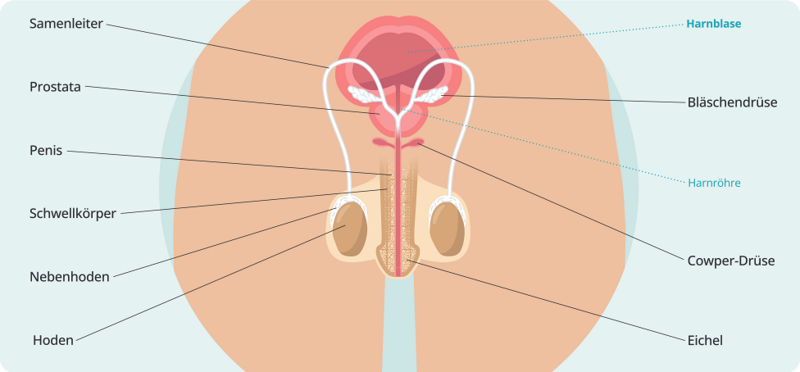 - Prostata: Die Prostata ist etwa kastaniengroß und zählt zu den männlichen Geschlechtsdrüsen. Sie liegt unterhalb der Blase und umhüllt die Harnröhre wie ein Mantel. Ihr Sekret sorgt für die Beweglichkeit der Spermien. Vor dem Samenerguss vermischen sich in der Prostata die Spermien mit den Drüsensekreten zur Samenflüssigkeit. Kommt es zum Orgasmus, ziehen sich Samenleiter und Prostata zusammen und pressen die Samenflüssigkeit aus der Prostata durch die Harnröhre und den Penis nach draußen.